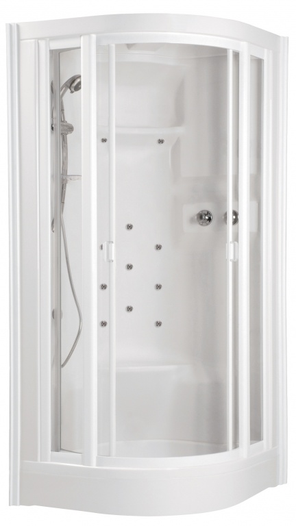 Decke, Mittelteil mit dem Sitzplatz, flache Wanne, Deckpaneel, Tür – Ausfüllung Pearl, Handdusche, Halter der Dusche mit Verstellung, Bewegungsstange der Dusche, Massagedüsen – 11 Stck., drehbare Batterie mit fünfpoligem Umschalter, thermostatische Batterie, Mündung der Handdusche, Boxensitzplatz, Abfluss, Deckleisten.