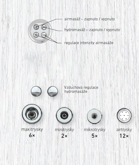 This version of hydro-massage baths virtually involves the two previous system configurations: EASY and WINDY. The base of the DUO massage system is made of six hydromassage maxi-jets and twelve air-jets that get activated either through a pump aspirating air when hydromassage is running or by a blower with a heater that warms up air in case of air-massage. Inevitable part of the DUO system is an electronic control unit with four keys on a control keyboard. Whether you press the key that activates hydro or air massage either of them has three working sequences: on, pulsation, off. An independent air regulator is mounted on the bath. It enables so that desired massage intensity may be chosen. The DUO LIGHT version has got one more key on its keyboard. The key puts on and shuts off the spotlight that is installed with this kind of a system. All the DUO and DUO LIGHT baths are furnished with a water-level sensor that prevents from random system activation just in case the bath is not sufficiently filled up with water which might cause a serious harm to the pump. All the components that are part of the DUO and DUO LIGHT hydromassage system abound in chrome-plated surface finishing.System specification: